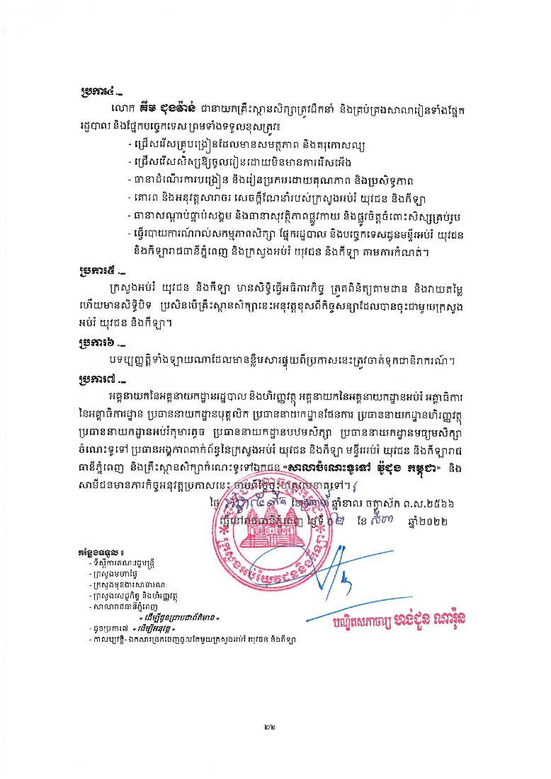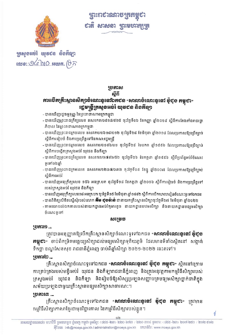 1. RECOGNITION- Officially recognized by the Ministry of Education Youth and Sport according to the Prakas Nº 1420 dated on August 02nd, 2022